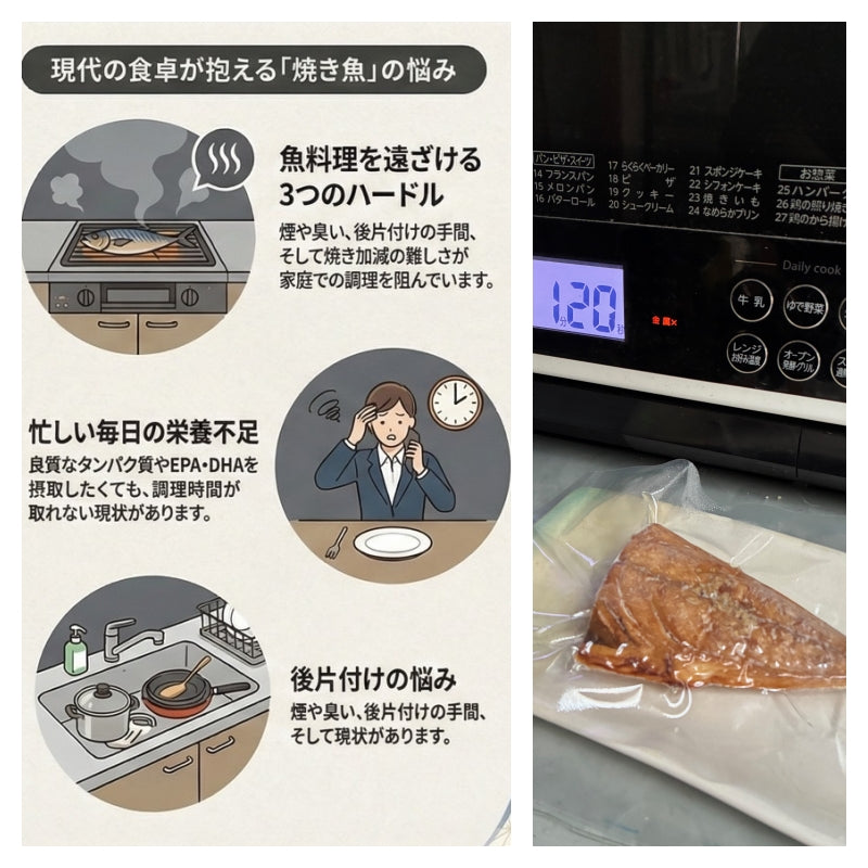 ご飯、お味噌汁、焼き魚の食卓は、ほっと一息つける和食の定番です。EPA,DHAを豊富に含む魚は健康にも良く、仕事や家事でお時間のない方、煙や臭いの問題で魚を焼けない方、コンビニ、外食など、食事が偏りがちな方、そんな方々に、実家のご飯のような、心が落ち着く幸せな食事をお届けしたい。その一助になれましたら幸いです。